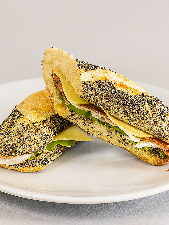 Un sándwich fresco y sofisticado: jamón serrano, rúgula, pesto y láminas de parmesano, servidos en pan de amapola. Sabor intenso con un toque mediterráneo.