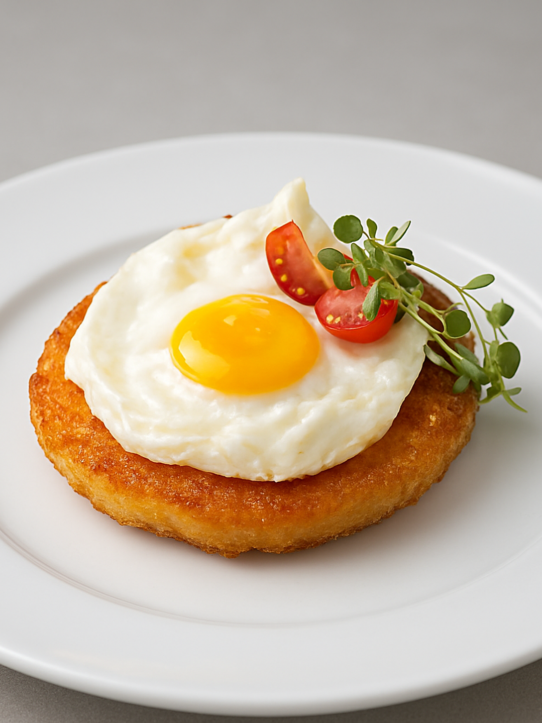 La forma más sabrosa de empezar el día: hash brown relleno con jamón y quesos fundidos, servido con huevo frito y nuestra salsa de la casa. Francia y comfort food en un solo plato.
